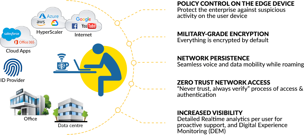 Work from anywhere is the new normal. C-RAN Secure Access will have your workforce up and running within minutes and more secure than ever before. Employees can connect securely and remotely to enterprise resources in the office datacenter and in the cloud. Detailed user diagnostics helps IT teams monitor connectivity to proactively improve the overall user experience.